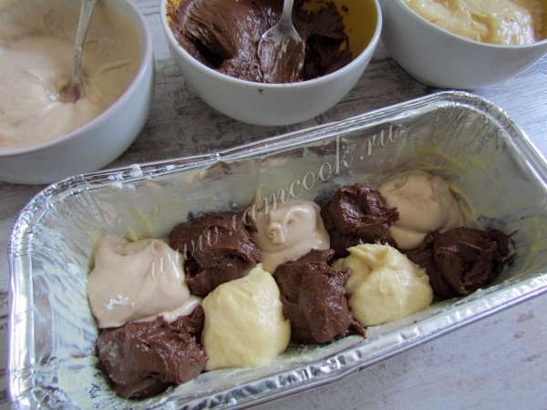 Смажьте форму сливочным маслом, присыпьте мукой и ложкой поочередно выкладывайте разноцветное тесто. Сверху разровняйте тесто лопаткой и отправьте в разогретую до 180 градусов духовку на 40-50 минут. Выпекайте кекс, ориентируясь на особенности вашей духовки - возможно время выпекания необходимо будет увеличить/уменьшить.