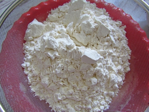 Муку просейте с разрыхлителем и щепоткой соли, добавьте в тесто.