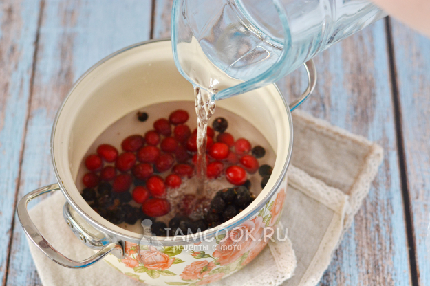 В кастрюлю положите замороженные клюкву и смородину и залейте холодной водой.