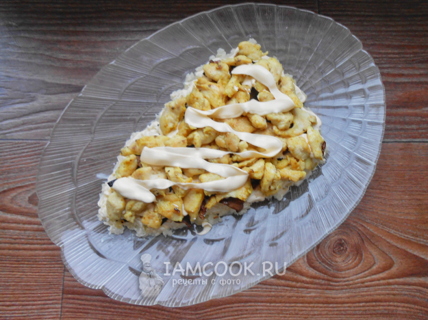 Сверху уложите слой жареного куриного филе и намажьте майонезом.