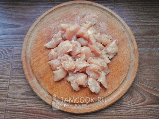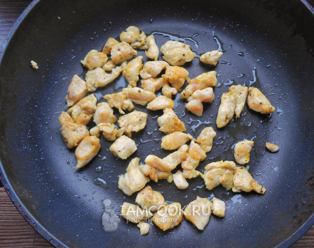 Обжарьте куриные кусочки на масле без запаха до лёгкой румяности. Готовьте на среднем огне, помешивая. Остудите.