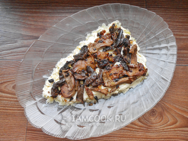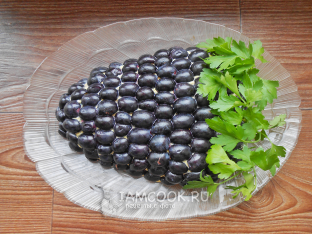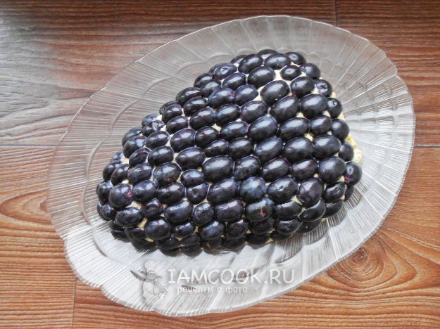 Поставьте салат «Виноградная гроздь» с курицей и грибами в холодильник на пару часов пропитаться.