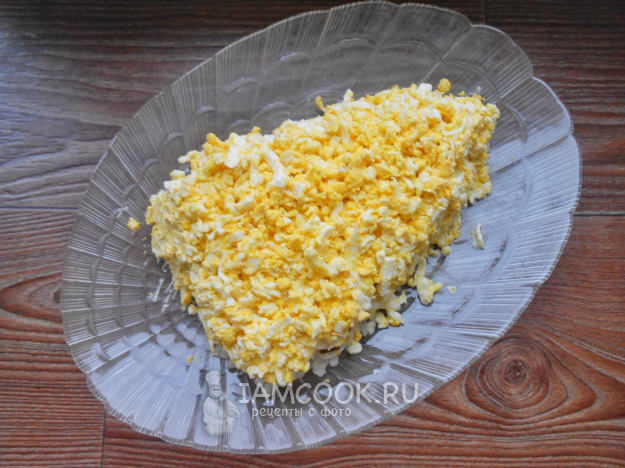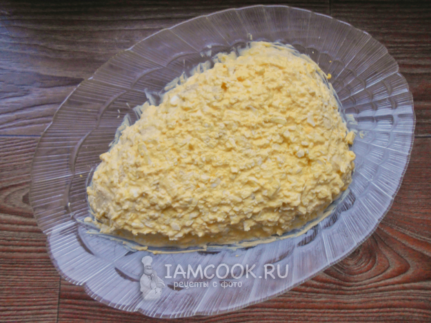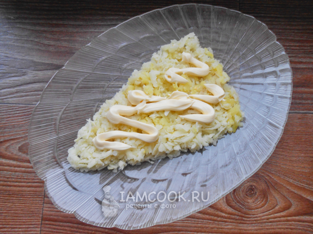 Выложите салат слоями на овальном блюде в форме треугольника. Первым слоем уложите картофель и смажьте майонезом.