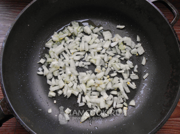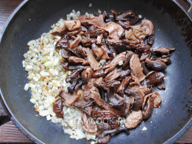 Добавьте в сковороду к луку отваренные белые грибы. Жарьте грибы с луком на небольшом огне в течение 7-10 минут, помешивая. Остудите.