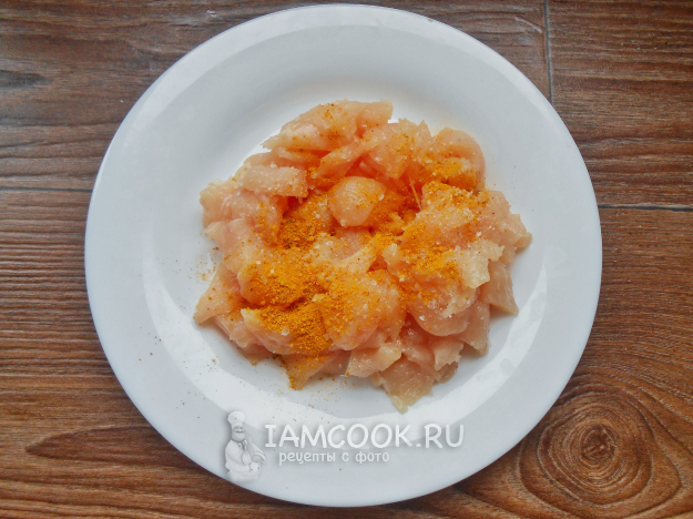 Приправьте филе солью и карри, втирайте руками специи в кусочки курицы.