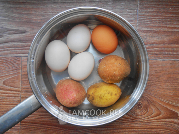 Отварите в кипящей подсоленной воде яйца и картофель. Можно всё варить в одной посуде, только яйца достаньте через 10-12 минут, а картофель варите до готовности.