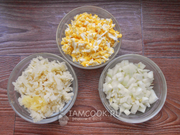 Почистите репчатый лук и нарежьте небольшими кубиками. Отваренные яйца и картофель почистите и натрите на крупной тёрке в отдельные ёмкости.