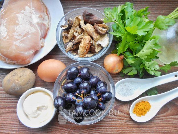 Для приготовления салата «Виноградная гроздь» с курицей и грибами соберите все необходимые ингредиенты по списку.
