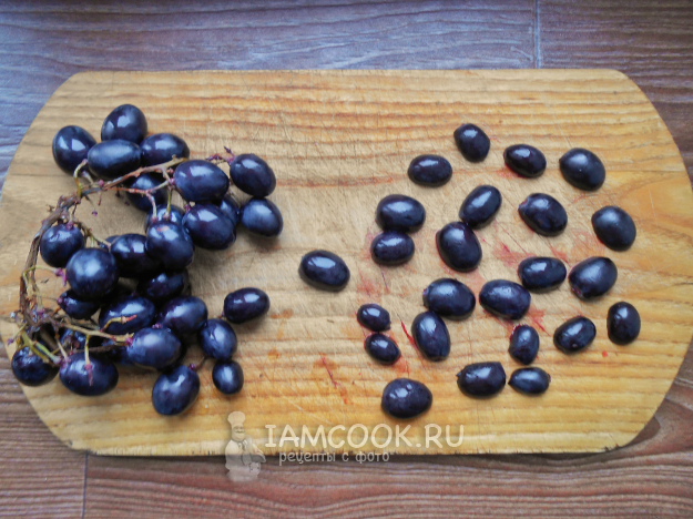 Синий виноград без косточек промойте и порежьте ягодки винограда пополам.