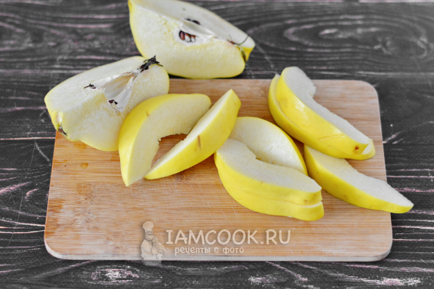 Айву разрежьте на 4 части, удалите семена и нарежьте на небольшие дольки.
