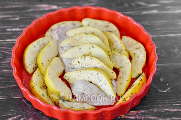 Смешайте айву с половиной маринада.
