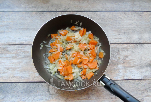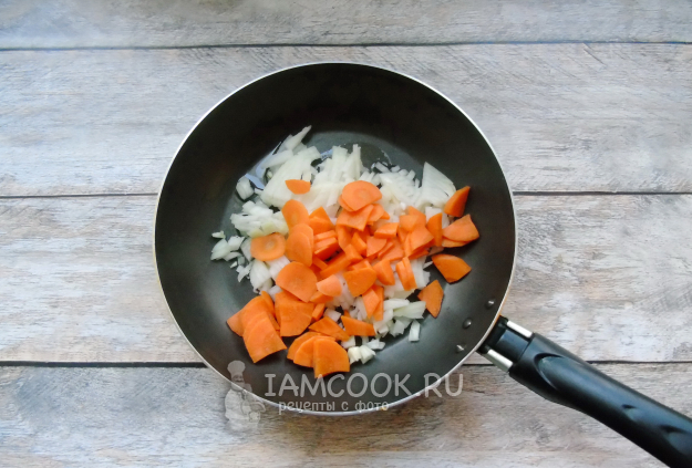 Морковь и лук очистите, помойте и нарежьте, как вам нравится. Выложите в сковороду.