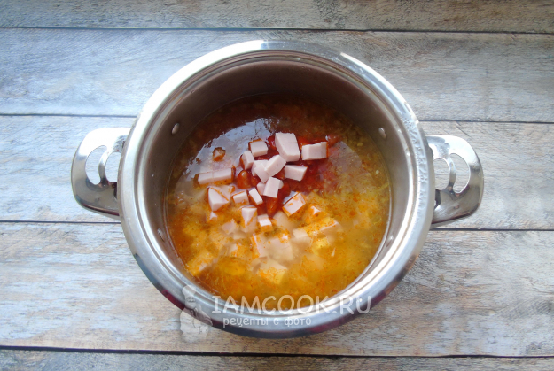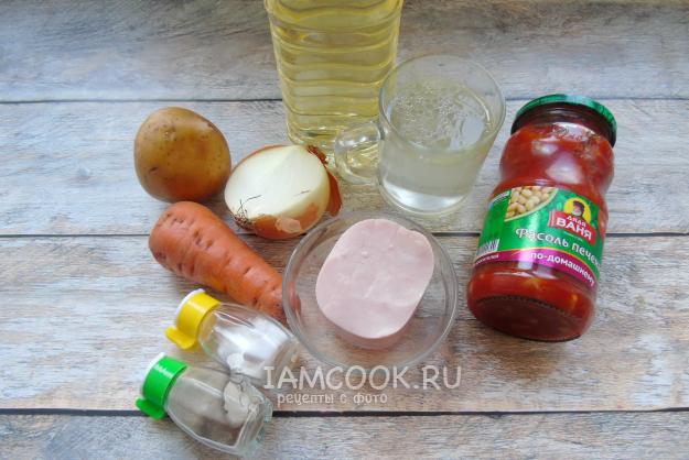Соберите ингредиенты для приготовления супа с фасолью и колбасой.