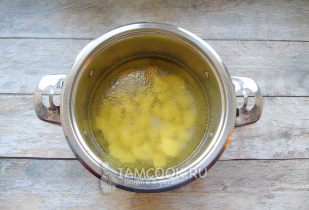 Картошку очистите, помойте и нарежьте. Выложите в кастрюлю с бульоном и начинайте варить суп.