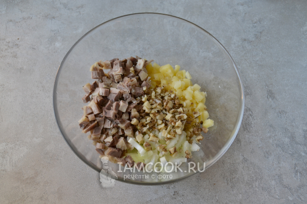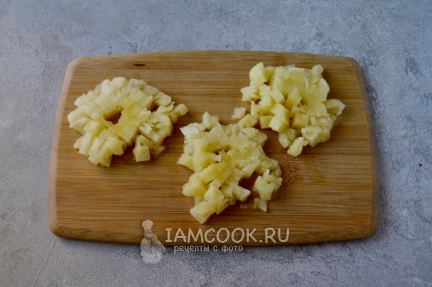 В салатнике соедините нарезанные ананасы, сельдерей, куриное мясо и грецкий орех.