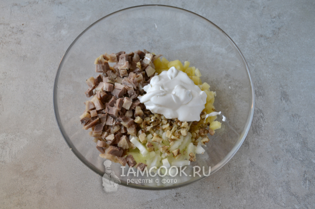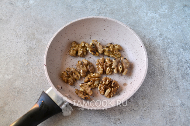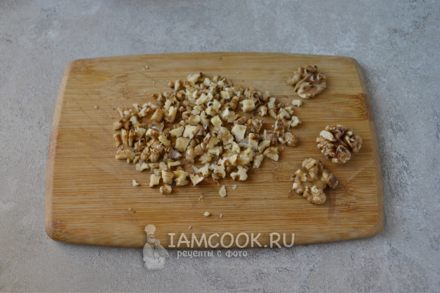 Орехи ножом порубите до крошки. Два-три орешка оставьте для украшения салата.