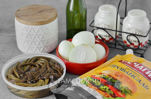 Подготовьте всё по списку для приготовления салата с папоротником и яйцом.