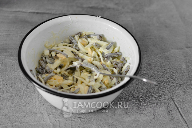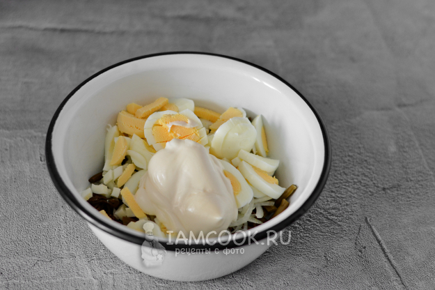 Сюда же добавьте нарезанные яйца вкрутую и майонез.