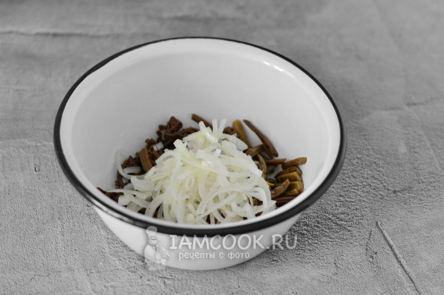 К нарезанному папоротнику добавьте замаринованный репчатый лук.