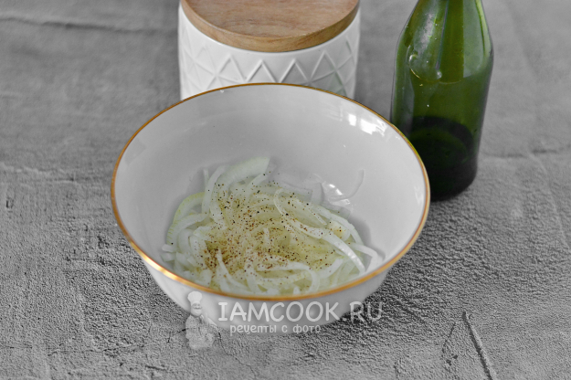 Лук нарежьте полукольцами, замаринуйте с сахаром, перцем и уксусом на 10-15 минут. Откиньте на сито, чтобы стёк маринад.