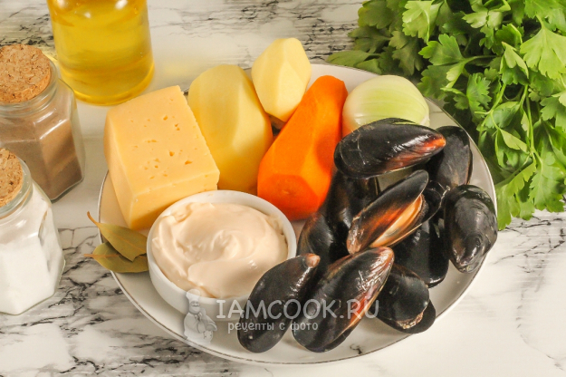 Продукты для приготовления сырного супа с мидиями - перед вами!