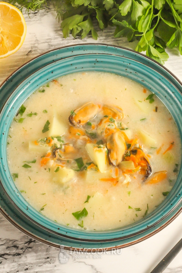Разлейте горячий сырный суп с мидиями в глубокие тарелки и сразу же подайте к столу.