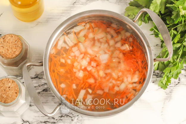 Очистите морковь и лук. Морковь натрите на терке с мелкими ячейками, а лук нарежьте мелкими кубиками. Добавьте в кастрюлю и отварите еще 5-7 минут. По желанию можно и обжарить эти овощи на растительном масле 3-5 минут, если любите более калорийные и жирные блюда.