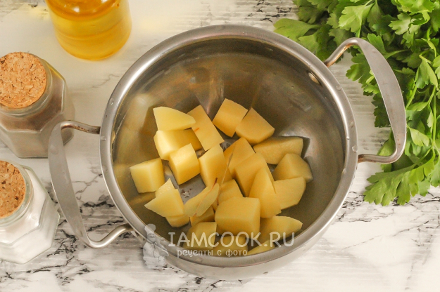 Картофель очистите от кожуры и нарежьте средними кубиками. Всыпьте нарезку в кастрюлю, добавьте лавровые листья и влейте воду. Отварите картофель примерно 10 минут на умеренном нагреве.
