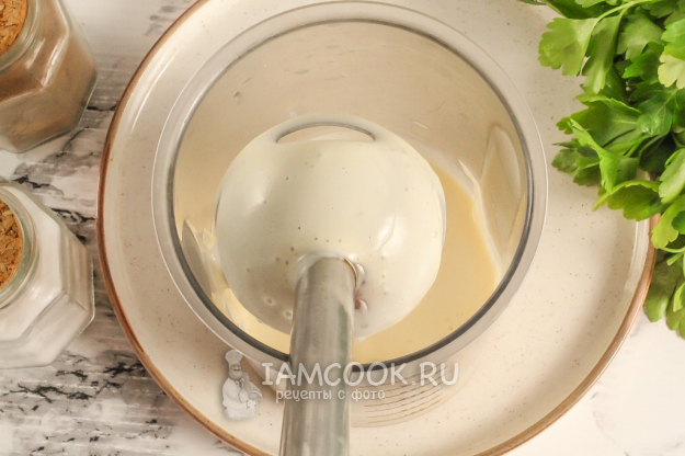 Начните добавлять тонкой струйкой растительное масло, не прекращая взбивать всю массу. По мере добавления масла майонез начнет густеть. Ни в коем случае не вливайте масло большими порциями - майонез не загустеет! Он не сэмульгирует и жидкость распадется на жир и яичную массу.