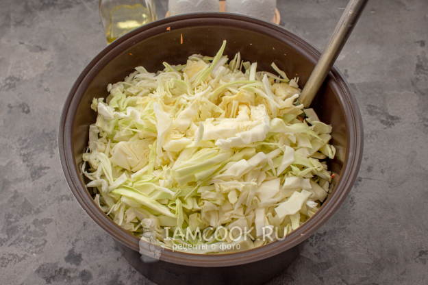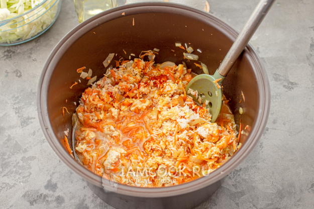 Добавьте капусту в чашу мультиварки. Установите режим "Тушение" на 40 минут. За 10 минут до конца приготовления откройте мультиварку, перемешайте тщательно все ингредиенты, посолите и поперчите.