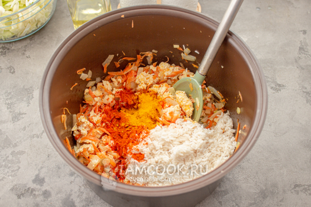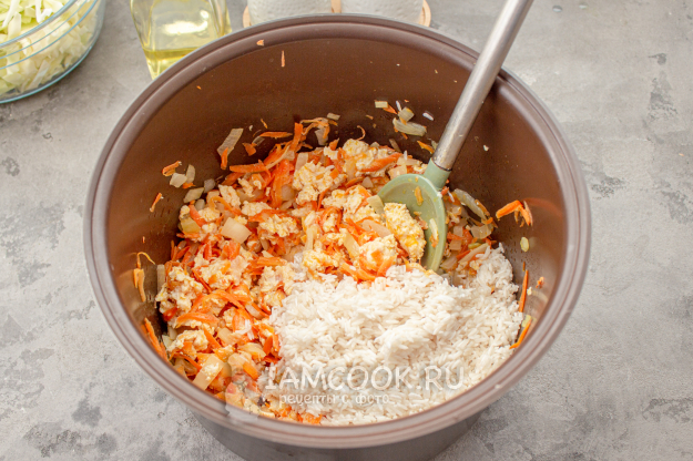 Рис промойте, добавьте в чашу мультиварки к овощам и рису.