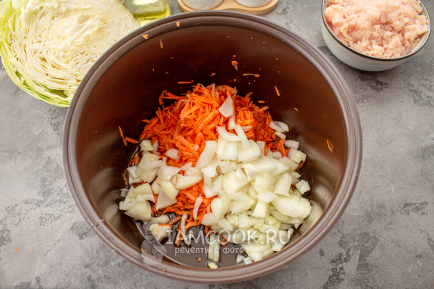 Лук очистите и нарежьте кубиком, морковь натрите на терке. В чашу мультиварки налейте масло, добавьте овощи. Установите режим "Жарка" на 15 минут. Готовьте овощи при этой программе 5-6 минут, периодически помешивая.