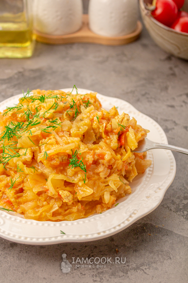 Приготовленную в мультиварке тушеную капусту с фаршем и рисом подавайте теплой. Можно присыпать зеленью и подать со сметаной. Приятного аппетита!!!