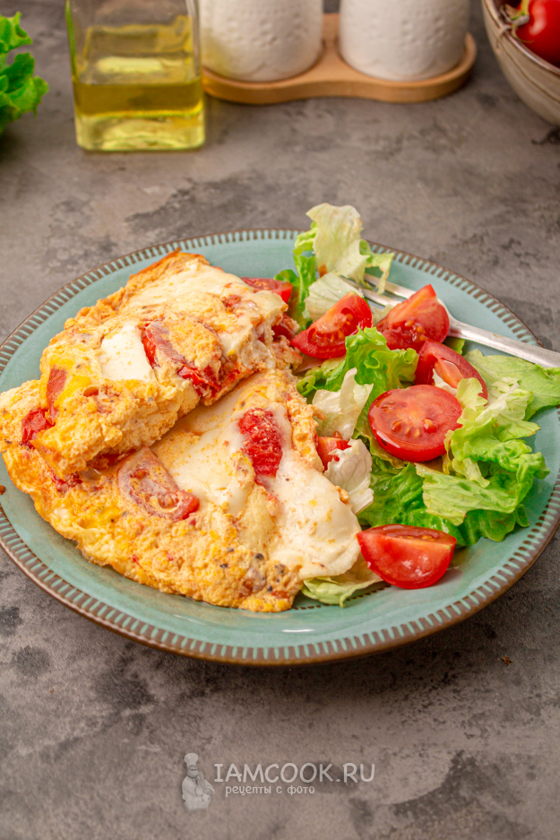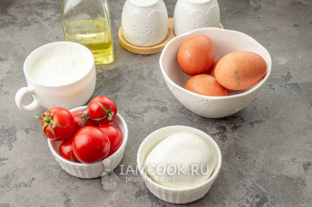 Все необходимые ингредиенты для приготовления омлета с моцареллой и помидорами - перед вами. По желанию, можете дополнить беконом, сушеным орегано или базиликом, сладким перцем или соусом "Песто".