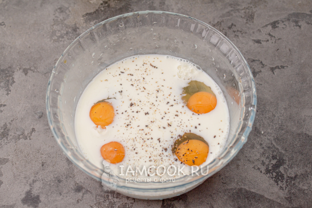 В миску вбейте куриные яйца, смешайте их вилкой или венчиком с молоком, солью и перцем. Взбивать не нужно! Всего лишь смешать, чтобы белок соединился с желтком.