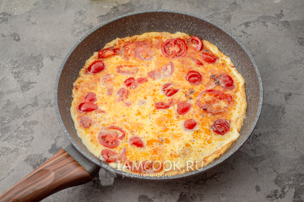 Влейте омлетную смесь, готовьте при небольшом нагреве 5-7 минут, до момента, когда верх омлета начнет "схватываться".