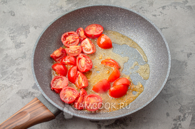 Сковороду диаметром 22-24 см раскалите, налейте масло и добавьте нарезанные помидоры черри или обычные томаты. Обжаривайте их буквально 2-3 минуты.