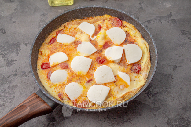 Сыр нарежьте на кружочки, выложите поверх. Готовьте омлет с моцареллой и помидорами 2-3 минуты при закрытой крышке. Готовое блюдо снимите с плиты и оставьте на пару минут в сковороде.
