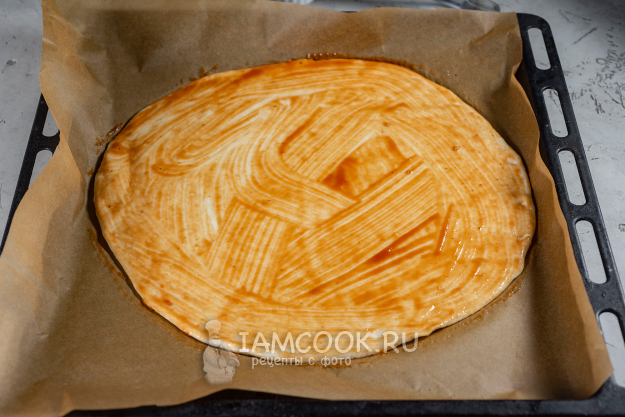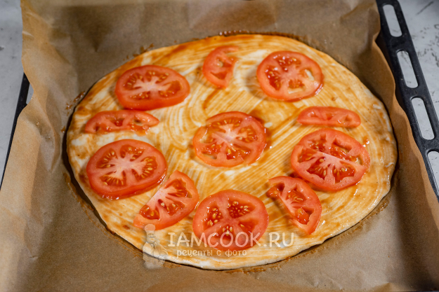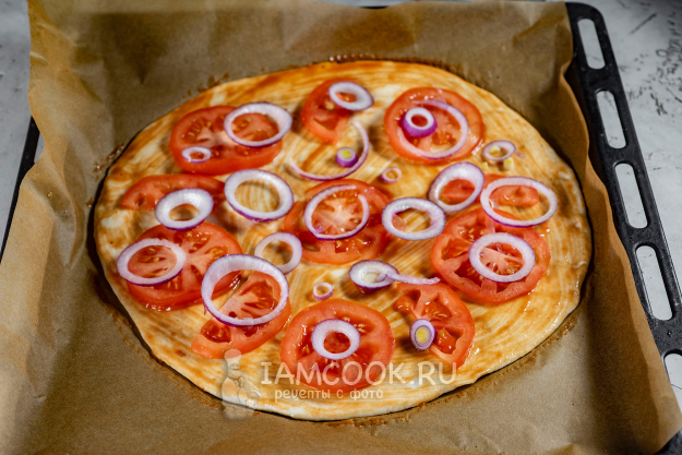 Сначала раскатаем одну часть в тонкий круг (у меня диаметр - 28 см). Очень удобно тесто раскатывать на пергаменте для выпекания. Поверхность теста смажем тонким слоем томатного соуса (2 столовые ложки), воспользовавшись силиконовой кистью.