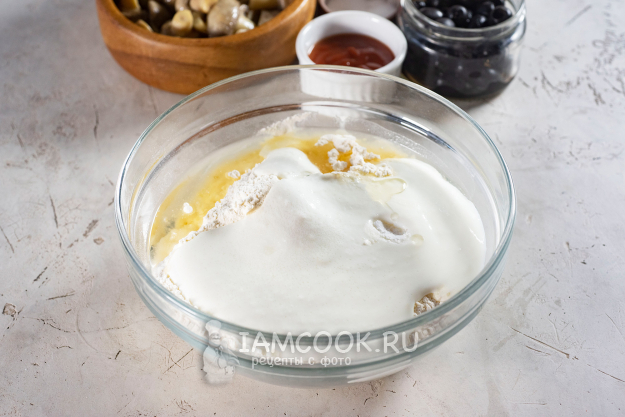 Готовим тесто. В миску всыплем всю муку, добавим соль, кефир, соду, растительное масло.