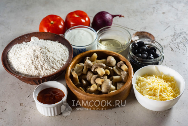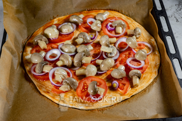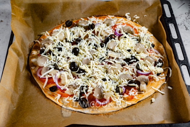 Будем выпекать пиццу с маринованными грибами в разогретой до 180 градусов духовке 20 минут. После чего в точности сделаем всё то же самое (раскатаем вторую часть теста, на которую выложим оставшиеся томаты, лук, маринованные шампиньоны, маслины и сыр) и приготовим вторую такую же пиццу.