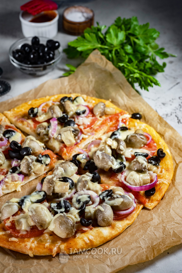 К столу пиццу с маринованными шампиньонами подаем, предварительно нарезав на порционные кусочки. Приятного аппетита!