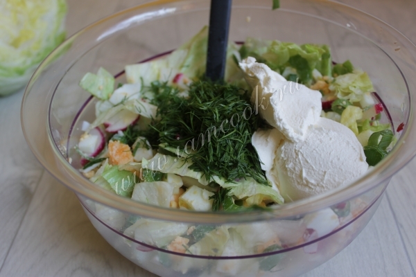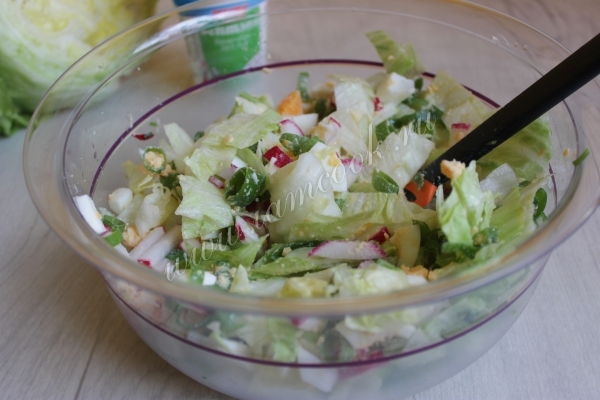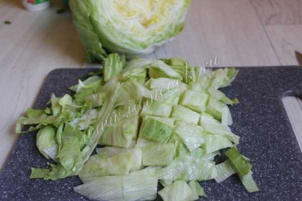 Вот такой салат нашла в своей записной книжке, когда-то давно видела его в программе Смак. Салат из салата айсберг с яйцом очень легкий и вкусный. Идеально подходит к летней погоде.