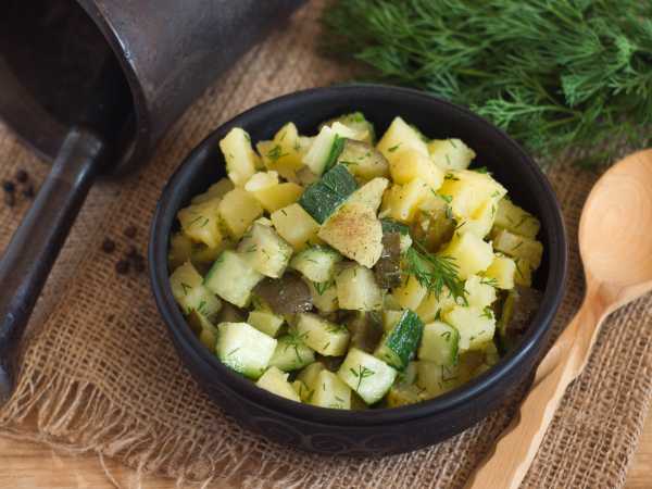 Промойте огурец в воде, смойте шипы и грязь с поверхности овоща. Срежьте хвостики с обеих сторон и нарежьте его полукольцами. Всыпьте все в миску или салатник.