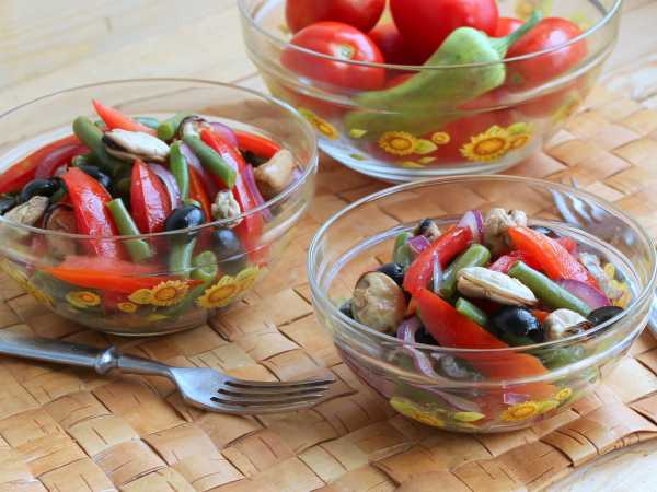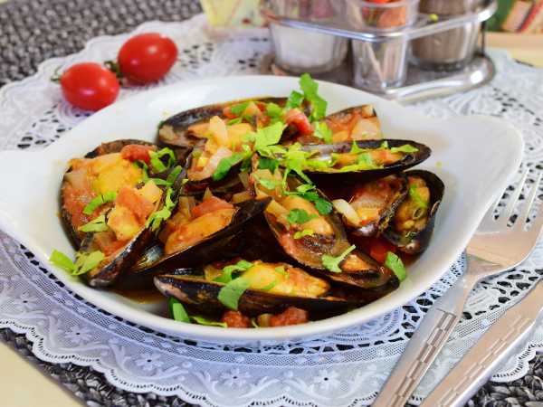 Выложите в емкость мидий в масле или отварных мидий. Если отваривали мидий в домашних условиях, то не забудьте удалить из них ногу, с помощью которой моллюск крепится к раковине.