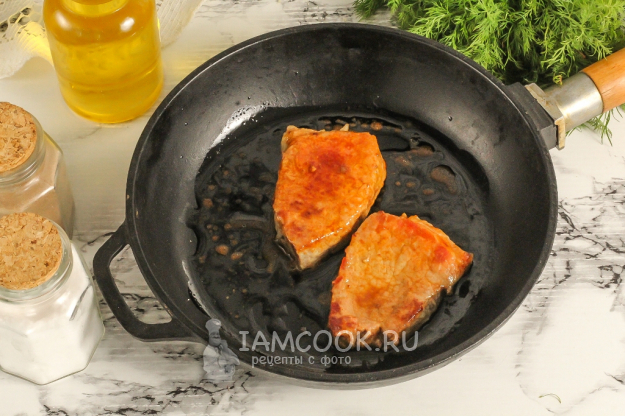 Затем прогрейте на сковороде растительное масло и выложите в него говядину прямо в маринаде. Прикройте емкость крышкой, чтобы масло не разбрызгивалось в разные стороны. Обжарьте по 3-4 минуты с каждой стороны до румяности. Чем толще нарезка, тем больше времени ее нужно прожаривать.