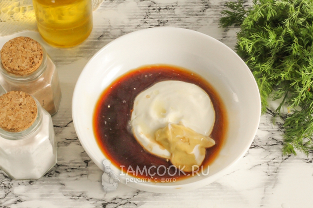 В глубокой емкости соедините сметану, соевый соус, горчицу и лимонный сок. По желанию сметану можно заменить нежирным майонезом или кефиром. Добавьте соль и тщательно всё перемешайте.