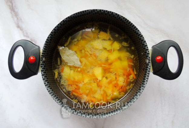 воды(сюда входит и рыбный бульон) добавляю горсть крупы –чечевица (красная