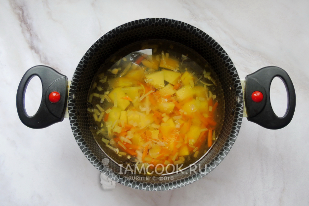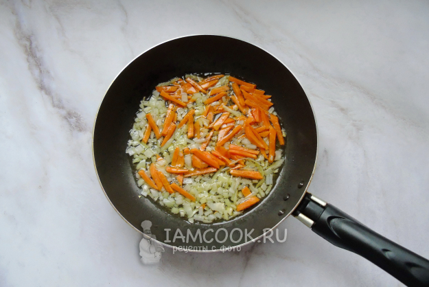 Пока горбуша варится, лук и морковь очистите, помойте и нарежьте. Выложите в сковороду с растительным маслом и пассеруйте 7-8 минут.