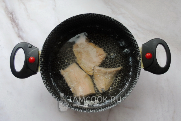 кипения, закладываю порционно нарезанную или растереблённую на дольки рыбу, закипит,